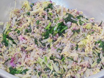 ↑ 今日は三重県産のぶりを酒としょうゆでつけ込み、米粉、片栗粉、カレー粉を合わせてぶりにまぶして油で揚げました。
