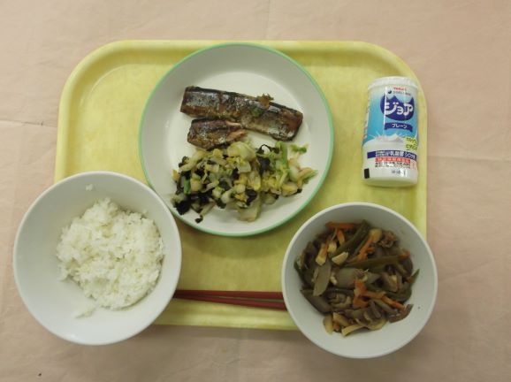 米、さば、卵、小松菜、牛乳、しいたけ、油揚げ、削節、豆腐、水耕ねぎ、みかん