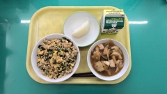 鶏そぼろ丼 牛乳 地物たっぷりみそ汁 梨