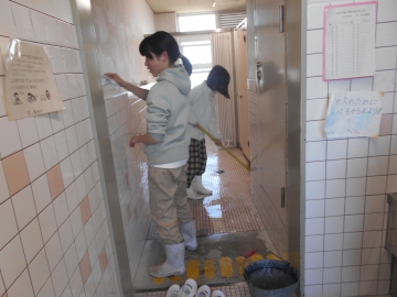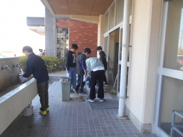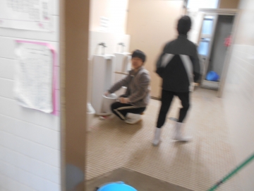 5限目は、児童玄関や職員玄関を中心に行いました。玄関にたまった砂を掃き出すだけでなく、玄関マットが汚れているから水洗いをしたいと言って、寒い中マットの水洗いをしてくれました。6限目は、がっつりトイレ掃除を行いました。校内にあるすべてのトイレを割り振りました。手洗い場をたわしで磨いたり、トイレの床に水をまいて、デッキブラシで磨いたり。最後には、便器を拭いてきれいにしてくれました。
