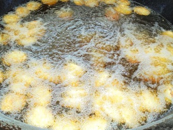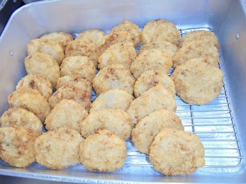 ★今日の「手作りれんこんメンチカツ」は,調理員さんの手作りです。れんこん,キャベツを細かく切り,豚ひき肉をまぜあわせてタネを作り,一つ一つ丸めてパン粉をつけて油で揚げました。