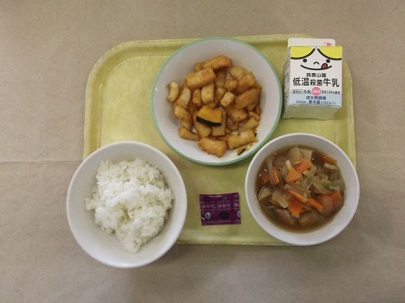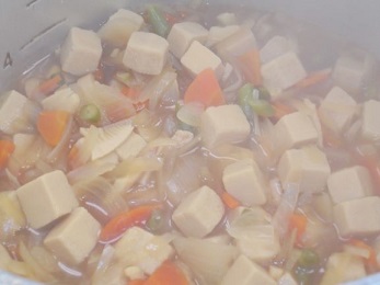 ☆高野豆腐は、昔から食べられている日本の伝統的な保存食です。豆腐を凍らせたりして、乾燥させて作ります。水分がぬけた分、豆腐の栄養やうまみがぎゅっとつまっています。また、骨や歯を丈夫にするのにかかせないカルシウムや、骨粗しょう症を予防するイソフラボンなどが多く含まれています。今日は、削り節でとったおいしいだしで煮た伝統的な料理です。