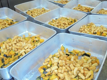 ☆「いかとかぼちゃのさらさあげ」は、いかはしょうが、酒、しょうゆに漬け込みます。小麦粉、片栗粉、塩、カレー粉を合わせ、かぼちゃといかにまぶして、それぞれ油で揚げました。