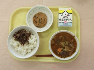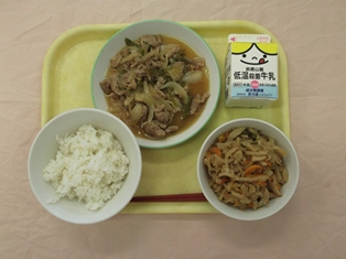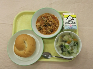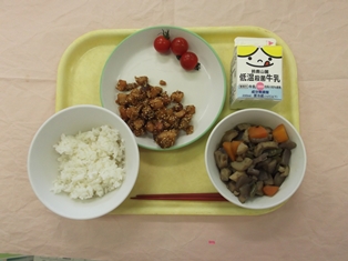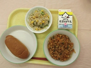 6月18日(月) 米飯 牛乳 豚肉のしょうが炒め 切干大根の煮物 残菜・・・23kg  6月19日(火) 米飯 かみかみふりかけ 牛乳 がんもどきの煮つけ 豚汁 残菜・・・17kg  6月20日(水) 米粉パン 牛乳 鶏肉のチリソース炒め ワンタンスープ 残菜・・・7kg  6月21日(木) 米飯 牛乳 さけの南部あげ ミニトマト 筑前煮 残菜・・・18kg  6月22日(金) 小型玄米パン 牛乳 ジャージャー麺 ナムル 残菜・・・8kg  |