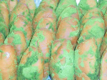 ↑ 給食室では、パンを油で揚げてから、緑茶の粉末と砂糖を混ぜ合わせたものをまぶします。