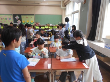朝、2年生が1年生にペンダントを渡しに行きました。おめでとうとメッセージを言いながら首からかけてあげていました。2年生、お兄さん・お姉さんです。