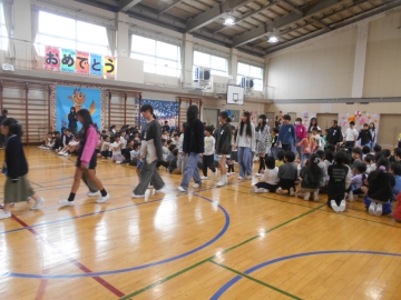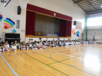 次は、6年生の出番です。6年生が1年生を教室へ迎えに行き、手をつないで体育館へ入場です。さすが最上級生といった余裕が感じられました。