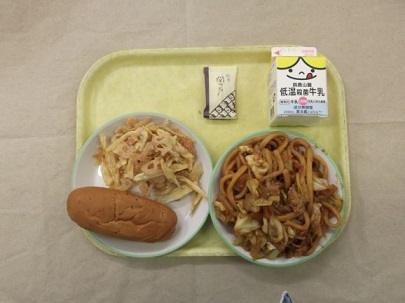 ☆みそ焼きうどんは、野菜や肉を一緒に鉄板で焼き、赤みそやみりんなどで作ったみそダレで味付けした焼きうどんです。給食では、豚肉にキャベツ、もやし、にんじん(四日市産 常盤地区)の具を入れて、みそ焼きうどんを作りました。