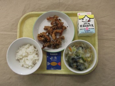★今日の鶏肉の茶らあげは,四日市産のお茶の葉が入ったからあげです。お茶は飲むだけでなく,食べることでビタミンや食物せんいなどの栄養をとることができるので,料理に使うのもおすすめです(^^♪