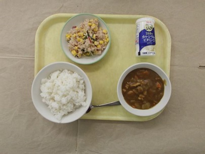 ★今日から2学期の給食が始まりました。人気のカレーライスとツナ・コーン・海藻の入ったさっぱりしたサラダです。