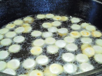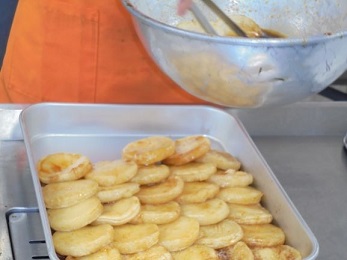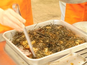 ↑ さとう、みりん、しょうゆで作ったたれを一つずつからめます。