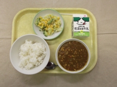 7/8 チーズ入りビーンズキーマカレー 牛乳 コーンサラダ
