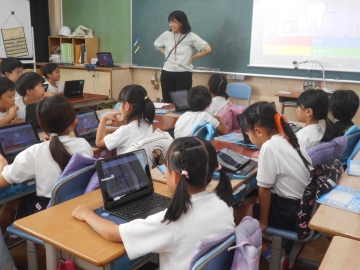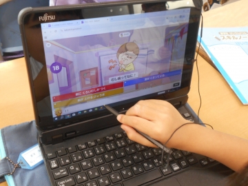 歯の種類と役割、歯の数、歯垢などについて学習をしました。子どもたちが驚いていたのは、歯垢は食べかすではないという問題でした。タブレットを使ってクイズ形式で行ったので、大盛り上がり!クイズで知識を得た後は、動画を見ながら歯磨きの練習をしました。