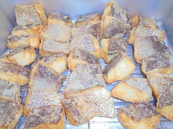 今日の給食では、鯛に酒と塩をふり、米粉と片栗粉を合わせて鯛にまぶし、油で揚げました。