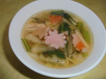 すまし汁には、にんじん、大根、たけのこ、白菜、小松菜(三重県産)と桜の形をしたかまぼこがはいっています。