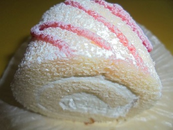 生クリームを巻き込んだやわらかいスポンジケーキに、ラズベリーソースがかかっています。