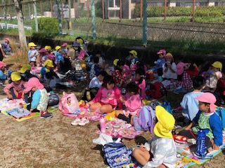 前回同様、学習の森に入った後、今回は運動場の端でお弁当を食べました。