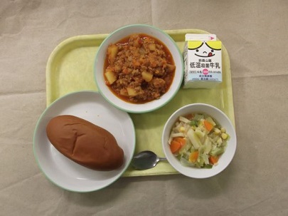 ★今日の「ポテトのミートソース」は,北海道産のじゃがいもを使い作りました。じゃがいもには,熱を加えてもこわれにくいビタミンCが含まれているので,たくさんのビタミンCをとることができます。