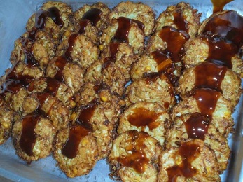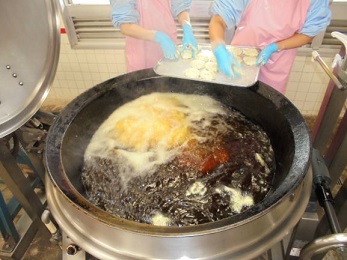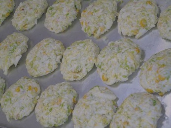 ★給食では大きな鉄板を使って焼くことはできないので,焼く代わりに調理員さんが一つ一つ丁寧に具を丸めて揚げてくれました。
