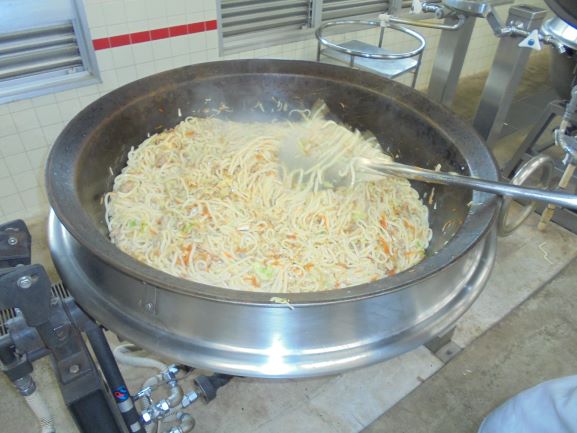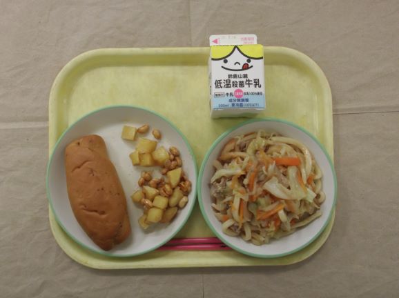 ★今日の「焼うどん」には豚肉や野菜をたくさん使っています。「じゃがいも入りフライビーンズ」のじゃがいもは,四日市市の桜地区でとれたものです。