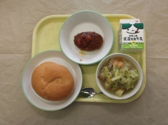 4/21 米粉パン 牛乳 ハンバーグのトマトソース煮 春野菜のスープ煮