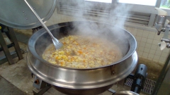 これは回転釜といいます。ハンドルを回すと前後に傾くお鍋です。
