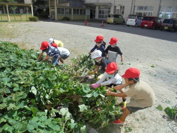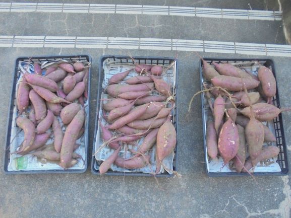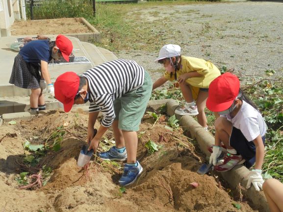 秋晴れの太陽のもと,サツマイモを収穫しました。