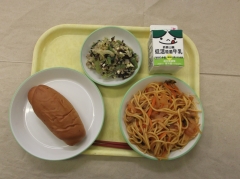 5/21 小型玄米パン 牛乳 豚肉とトマトのスパゲッティ 骨こつサラダ