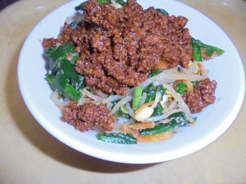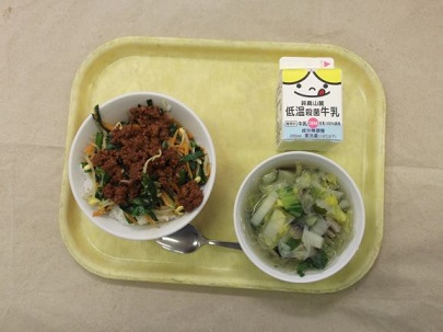 ↑ ごはんの上に具をのせて,その上に肉みそをのせて盛りつけました。今日のビビンバは,にらがたっぷり入っていたり,みその中にひき肉が入っていたりといつもと少し違っていましたが,おいしく味わっていただきました。