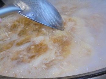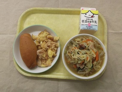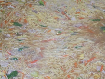 ★いままでのラーメンと違うところは,給食室で麺を具と一緒にスープに入れ,煮込んで作ることです。ラーメンの具と麺,スープが一つの食缶に入って教室に届きました。釜で煮込んだものを教室で配食するので冷めにくく,温かいまま食べられるので体がぽかぽかになりました。