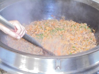 ★今日の豚丼の具は豚肉といっしょに,にんじん・たまねぎ・ごぼう・いんげんを炒めて,砂糖・みりん・たまり醤油で味付けしたものをごはんにのせて食べました。