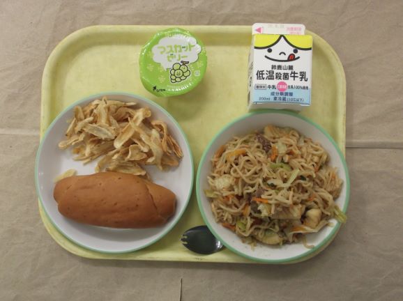 ★今日の焼きそばにはかみごたえのある「いか」がはいっています。日本近海には90種類以上のいかが生息していると言われています。いかは,体によい「たんぱく質」が多く,「脂肪」が少ないのが特徴です。いか焼きそばとごぼうチップスで,しっかりとよくかんで食べることができるかみかみメニューです。