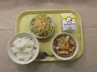 ♢今日の中華飯の具には,豚肉,いか,にんじん,たまねぎ,しいたけ,まこもたけ,うずら卵,白菜を使っています。肉やたくさんの野菜を使っているので,うま味や栄養がたっぷりです。今日の白菜も四日市産(県地区)です。