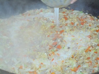 ↑水でといた片栗粉を入れてとろみをつけると,料理が冷めにくく,体も温まります。
