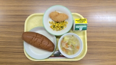 黒糖パン 牛乳 たらフライ コーンソテー 春野菜のスープ煮