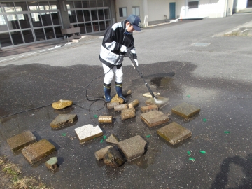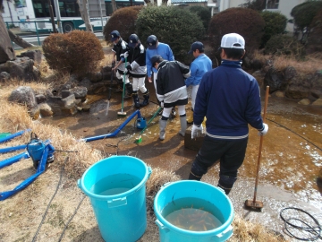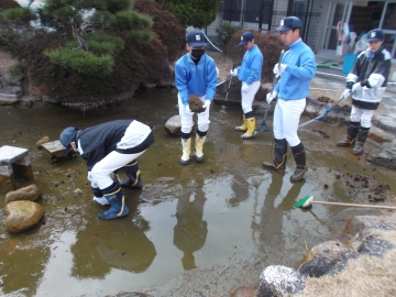 春本番を思わせるような温かい陽ざしに恵まれた本日、生徒玄関前の池掃除を行いました。