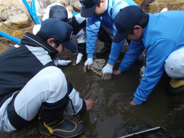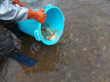 少し水は冷たかったですが、そのうち手を池の中に突っ込んで魚を直接捕獲したり、底に堆積した落ち葉などを拾ってくれたので、作業がスピーディかつスムーズに進みました。