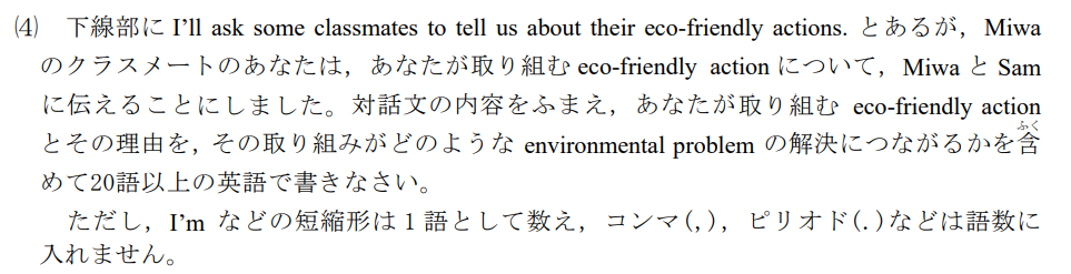 下のように(4)では、あなたのeco-friendly action、つまり、あなたが取り組んでいる「地球にやさしい行動」をこたえる問題になっています。
