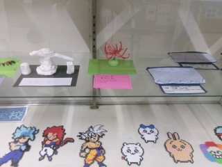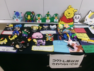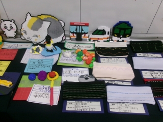 アイロンビーズと裁縫(さいほう)、紙粘土による作品です。