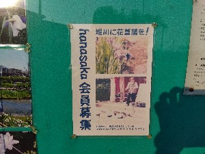 掲示板には「堀川に花菖蒲を! hanasaka会員募集」のポスターがありました。