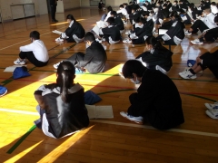 体育館で学年集会を開き、各クラスの良かったことと3学期で改善していくことを発表しあいました。体育祭や文化祭でクラスが団結して取り組めたこと、学習時にも話し合いなどをしながら協力して学びあえたこと、あいさつをするなどコミュニケーションを活発にできたこと、提出物の期限を守ることなど、様々な振り返りがありました。ぜひ、3学期に生かして欲しいと思います。
