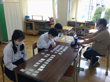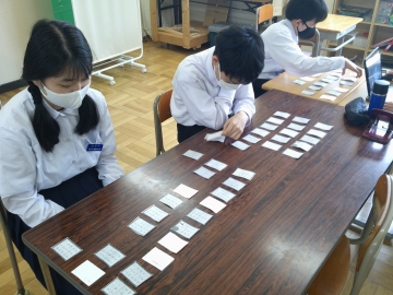 国語の時間に「かるた取り」をしました。ひとり1セットずつかるたを用意し、自分のペースでめあての札を探しています。はじまりの言葉は何か?話をよく聞きながら取り組むことができました。もう少し慣れてきたら、百人一首で上の句から下の句を探す活動にチャレンジしていく予定です。
