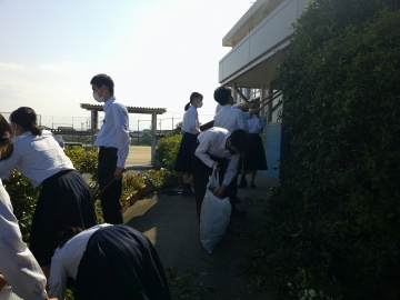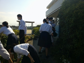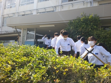 夏を目前にし、草木がぐんぐんと成長してきています。掃除の時間に生徒たちが草木のお手入れにチャレンジしています。初めて剪定ばさみを使う生徒も多く、プロのようになかなか上手くは整えれませんが、どこを切ったら見栄えが良くなるか、考えながら取り組んでいました。