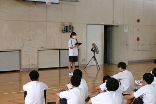 今日の2限目に学年集会がありました。まず、各クラスの学級委員が1学期を振り返り、クラスの成長したことや2学期への課題などを発表しました。子ども達は暑い体育館の中でも静かに姿勢よく学級委員の発表を聞いていました。2学期は各クラスの課題を達成し、今よりも成長できるように頑張りましょう。
