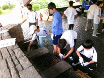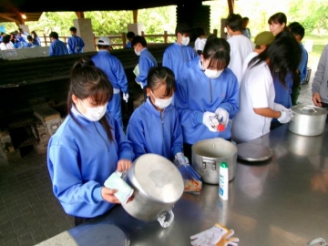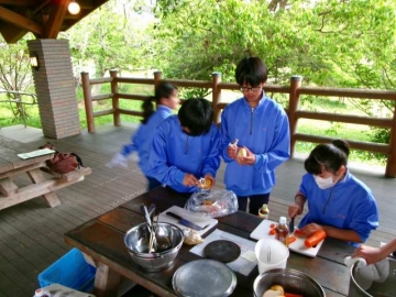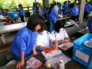 野外炊飯がスタートしました。火をおこしたり、野菜を切ったり、各班で役割分担しながら取り組んでいます。