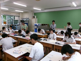 次に、2年生の美術の様子を見ていただきました。無地のトートバックに思い思いのデザインを描いている真剣な姿に、「とても集中力を持って描いている。細かな作業も丁寧に行っていますね」とおっしゃっていました。