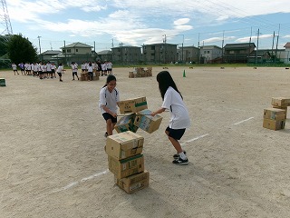 1年生は、今夏を思い起こさせる暑さにも負けず、元気いっぱいに大切な荷物を運んでいました。各クラスでみんなで輪になって話し合っている姿や、実際に様々な工夫を試す姿などがみられました。体育祭本番に向けて、どのクラスも精一杯、努力を重ねていました。