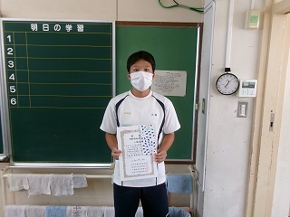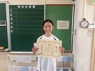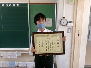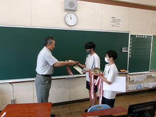 学校に届いた賞状を手渡し、学校全体でその功績をたたえました。