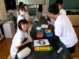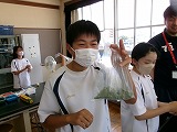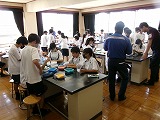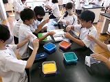 生徒の皆さんは、すべてを混ぜてコネコネしながら、材料が合わさることで色が変わったり、一つにまとまっていったりする様子を観察し、入浴剤を作る工程を学びました。