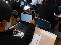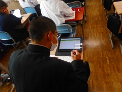 問題をネット上で確認し、記号等で答えるものはタブレットを使って回答し、文章等で答えるものは回答用紙に書いていきます。